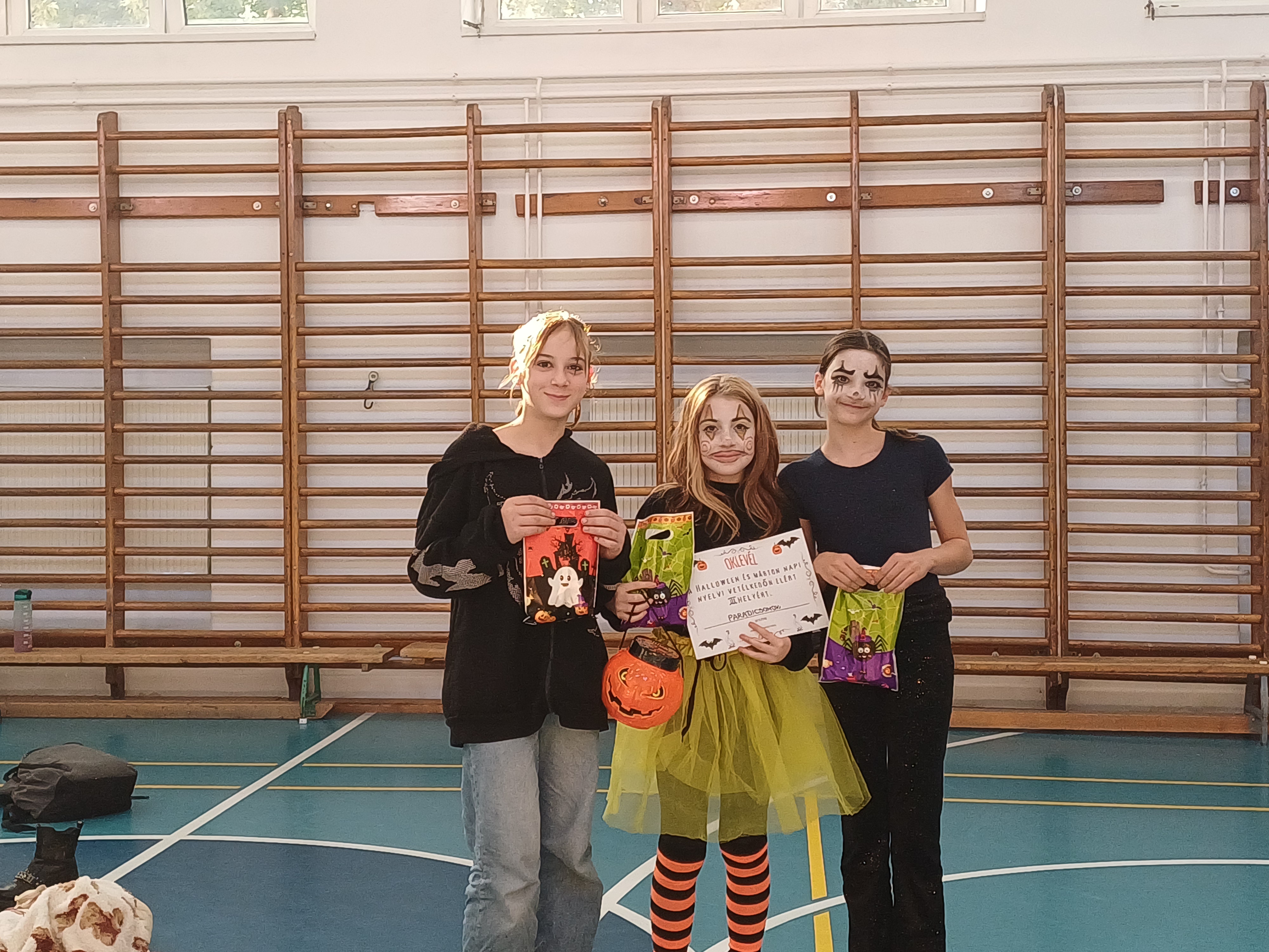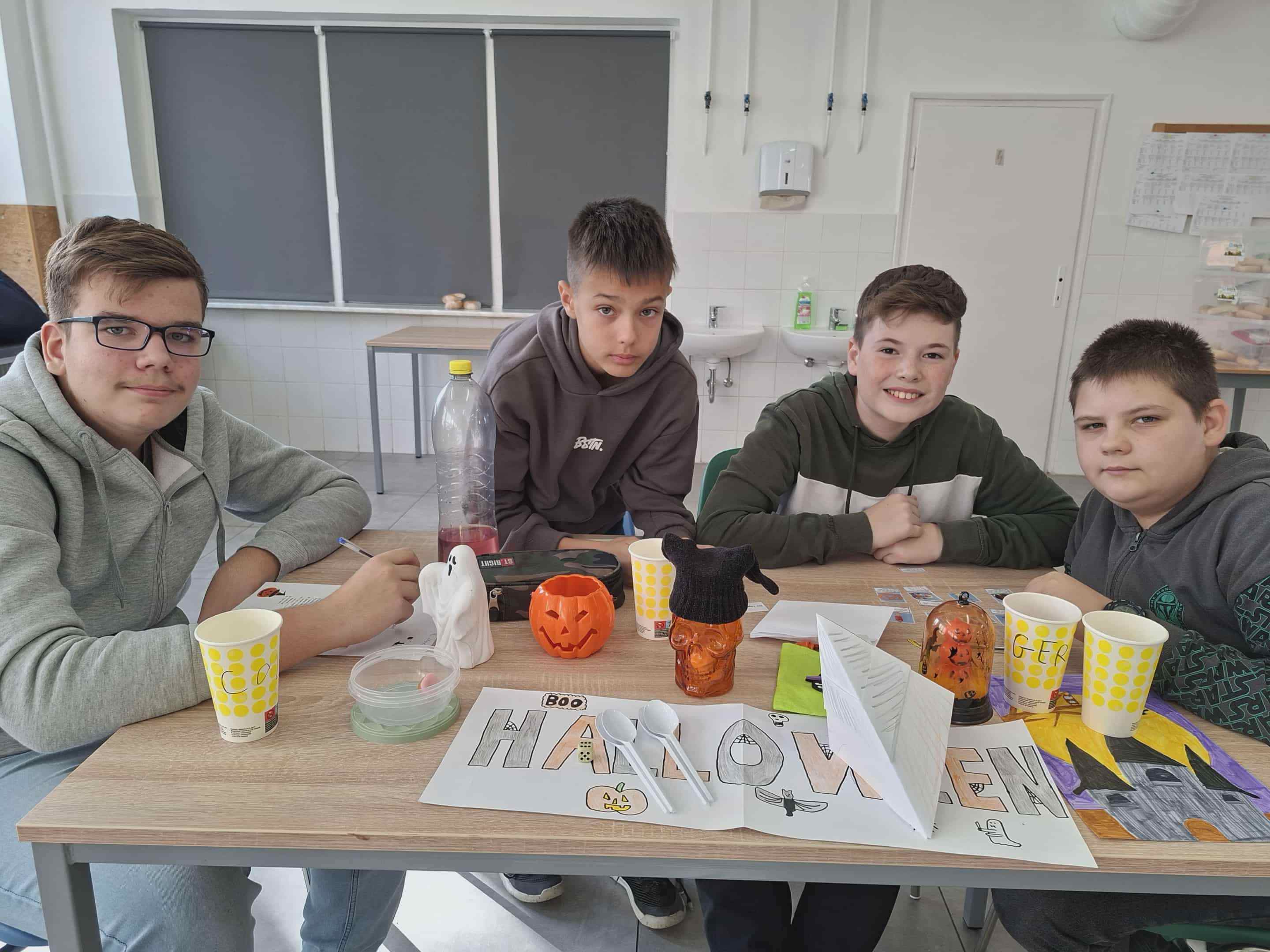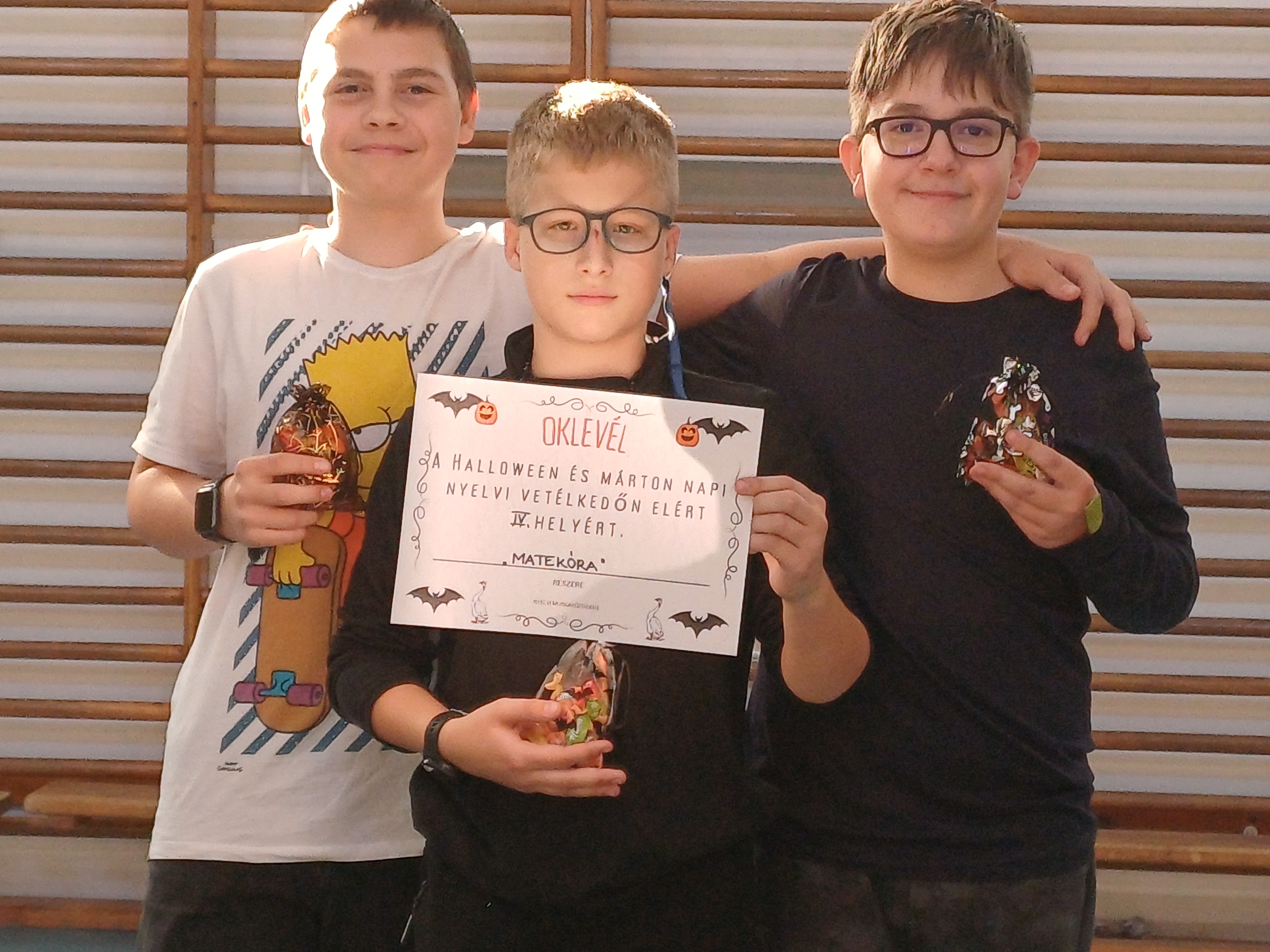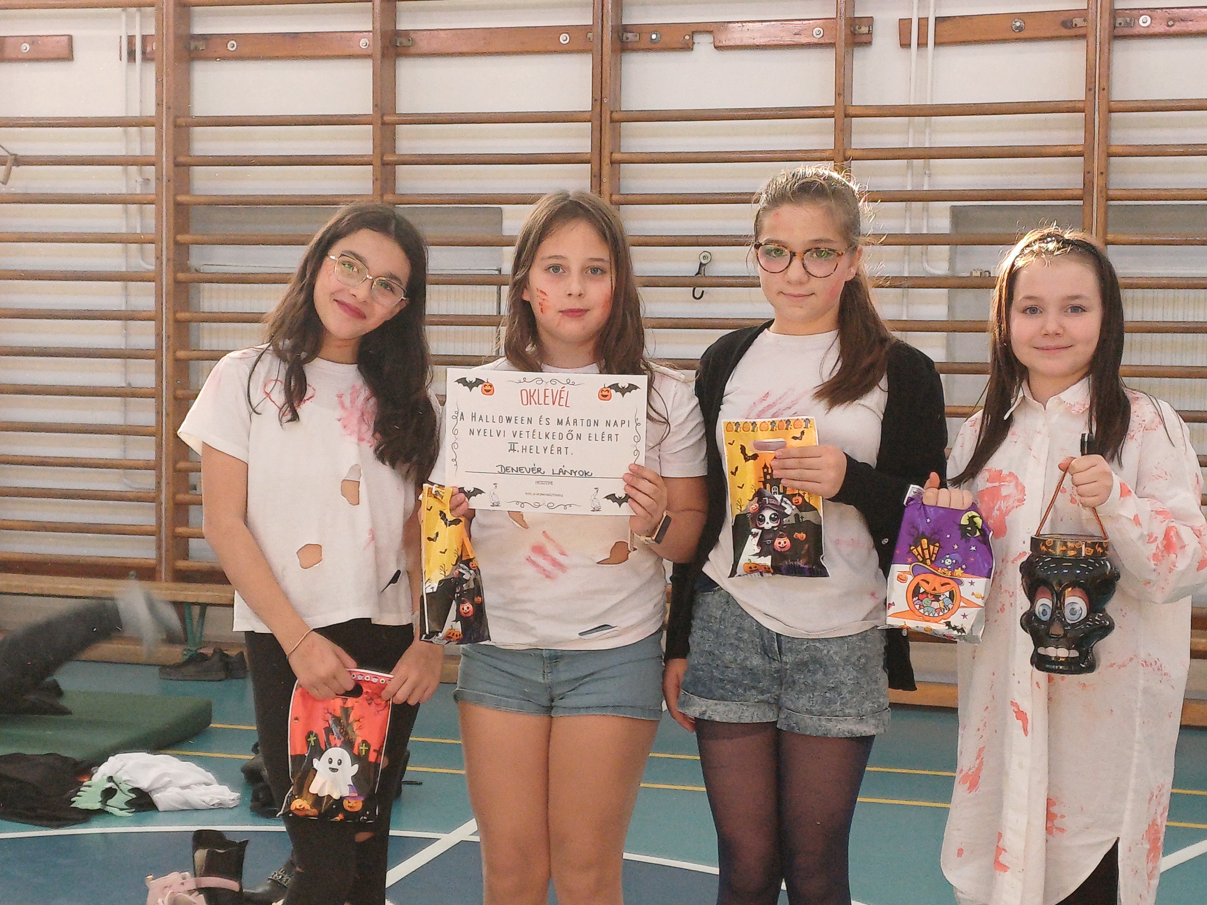 Az idei Halloween – Márton napi vetélkedőnket október 17-én szerveztük meg. Két helyszínen, külön-külön mérték össze tudásukat az ötödikesek és hatodikosok, illetve a hetedik és nyolcadik évfolyam. A 7-8. évfolyamból versenyző vegyes csapatoknak nyelvi totót, keresztrejtvényt kellet megoldaniuk, interjút készítettek az adott célnyelven, verseltek, énekeltek, és mindemellett vidám ügyességi feladatokat oldottak meg. Ötödik és hatodik évfolyamon öt, négy fős csapat mérte össze tudását és ügyességét. A versenyre előzetesen plakátot és finom sütit is készítettek. A tanulók angol és német nyelven oldották meg a változatos feladványokat. A különböző feladatok között szerepelt szókereső, nyelvtörő, találós kérdés vagy éppen fordított szórejtvény. A jó hangulatot tovább fokozta az almahalászat és a vidám „libatömés”, ahol pólóba bújt „libákat” kellett újságpapírral megtömni. A délután remek hangulatban telt, minden résztvevő élményekkel és nevetéssel gazdagodott.A végén nagy volt az öröm, mikor a díjazottak megkapták az ajándékcsomagjukat, melyet idén is a Boldog Gyermekekért Alapítvány biztosított számukra.